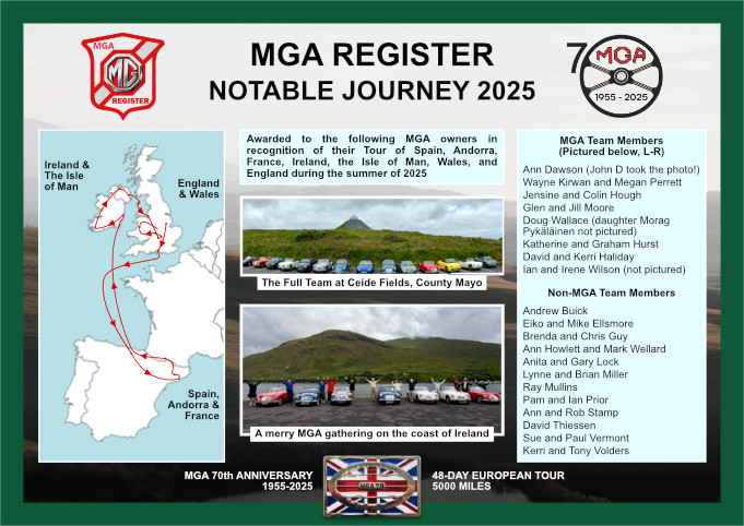 The 2025 “Notable Journey Award” goes to an intrepid group of MGA Owners based mainly in Australia who completed a 4800-mile tour of Europe in May and June 2025. The Tour included the Celtic Classic MGA Spring Tour in Ireland and then MGA Day at Fawley Hill. This epic “Grand Tour” was undertaken to celebrate the 70th Anniversary of the MGA and demonstrates what a magnificently practical car the MGA is, despite its “maturity”.