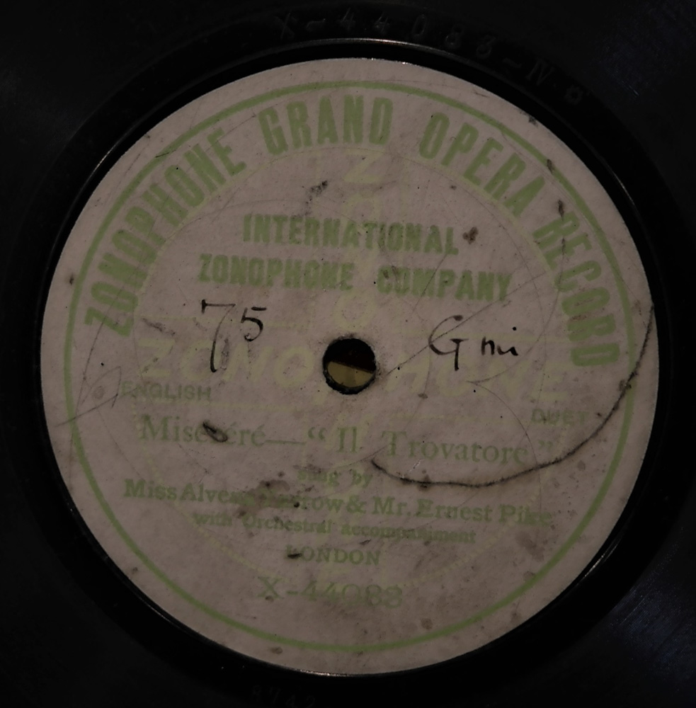 CK’s next disc for consideration  is the Miseréré from Il Travatore sung by Miss Alvena Yarrow and Mister Ernest Pike(CK7). Neither name will mean much to anybody who reads this, and for a good reason.  Until the mid-1920s recording artists would use a multitude of names in order to surreptitiously break their contracts (probably the only advantage inherent in the poor sound reproduction), or, for reputational reasons, to record in genres they did not wish to be associated with.  Eleanor Jones-Hudson (1874-1946) a.k.a. Alvena Yarrow was a Welsh soprano who used a total of 16 names throughout her career.  Ernest Pike (1871-1936), his real name, used a total of 19 pseudonyms.  Peter Dawson, the noted Australian baritone used 30 names as a singer, and another 9 as a composer.  There is no parallel to this in today’s music communities.