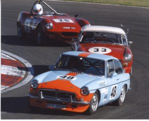 Tom Stewart leading in his Class D MGB GTV8 racing with No. 1 as he was the BCV8 Champion.