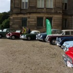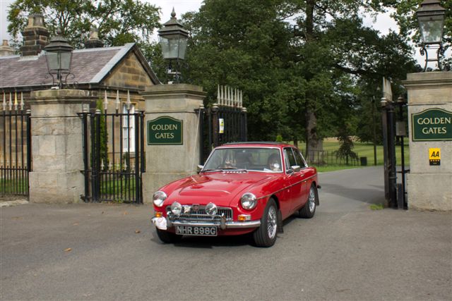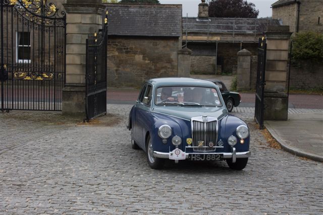 After the initial 15 or so miles crossing several bridges over the Tees in the industrial areas of Teesside the cars found their way through the splendid grounds of Wynyard Hall. Wynyard Hall is now owned by Sir John Hall with a neat twist in that the Hall and its thousands of acres were built from the profits of the coalfields owned by the Londonderry family and is now in the hands of the son of a coalminer. The carsĀ are seen coming out through the Golden Gates – even if they are black!